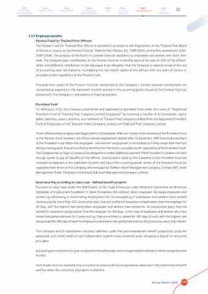 The Pension Fund for Thailand Post Officers is operated in accordance with Regulations of the Thailand Post Board of Directors, Issue 6, on the Pension Fund for Thailand Post Officers, B.E. 2548 (2005), and its first amendment of B.E. 2549 (2006). The purpose of the fund is to provide financial assistance to employees and workers who retire from work. The Company pays contributions to the Pension Fund on a monthly basis at the rate of 10% of the officers’ salary and additional contribution at the rate equal to an obligation that the Company is required to pay at the end of accounting year calculated by multiplying the last month salary of the officers with the years of service in accordance with regulations of the Pension Fund.