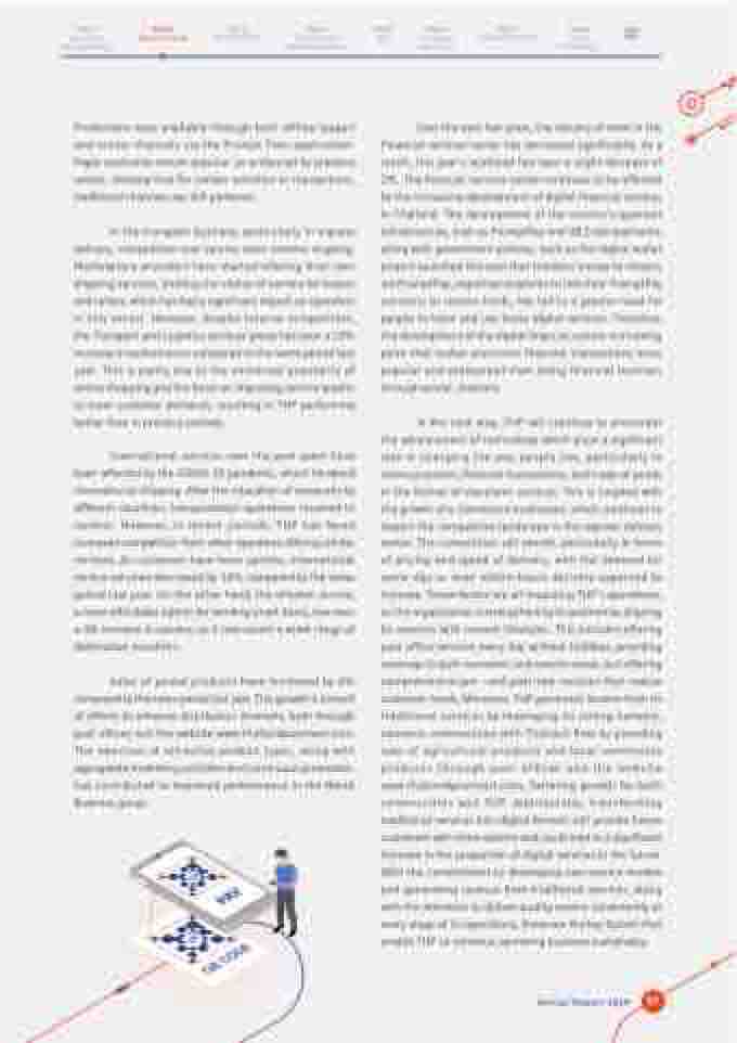 In the next step, THP will continue to encounter the advancement of technology which plays a significant role in changing the way people live, particularly in communication, financial transactions, and trade of goods in the format of electronic services. This is coupled with the growth of e-Commerce businesses, which continues to impact the competitive landscape in the express delivery sector. The competition will persist, particularly in terms of pricing and speed of delivery, with the demand for same-day or even within-hours delivery expected to increase. These factors are all impacting THP’s operations, so the organization is strengthening its position by aligning its services with current lifestyles. This includes offering post office services every day without holidays, providing coverage in both economic and remote areas, and offering comprehensive pre - and post-sale services that realize customer needs. Moreover, THP generates income from its traditional services by leveraging its strong network, connects communities with Thailand Post by providing sale of agricultural products and local community products through post offices and the website www.thailandpostmart.com, fostering growth for both communities and THP. Additionally, transforming traditional services into digital formats will provide future customers with more options and could lead to a significant increase in the proportion of digital services in the future. With the commitment to developing new service models and generating revenue from traditional services, along with the attention to deliver quality service consistently at every stage of its operations, these are the key factors that enable THP to continue operating business sustainably.