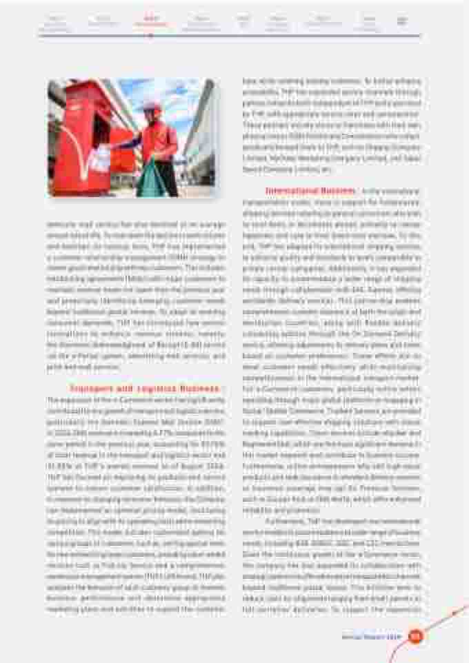 International Business : In the international transportation sector, there is support for fundamental shipping services catering to general consumers who wish to send items or documents abroad, primarily to convey happiness and care to their loved ones overseas. To this end, THP has adapted its international shipping services to enhance quality and standards to levels comparable to private courier companies. Additionally, it has expanded its capacity to accommodate a wider range of shipping needs through collaboration with DHL Express, offering worldwide delivery services. This partnership enables comprehensive customs clearance at both the origin and destination countries, along with flexible delivery scheduling options through the On Demand Delivery service, allowing adjustments to delivery dates and times based on customer preferences. These efforts aim to meet customer needs effectively while maintaining competitiveness in the international transport market. For e-Commerce customers, particularly online sellers operating through major global platforms or engaging in Social/ Mobile Commerce, Tracked Services are provided to support cost-effective shipping solutions with status tracking capabilities. These services include ePacket and Registered Mail, which are the most significant demand in this market segment and contribute to business success. Furthermore, online entrepreneurs who sell high-value products and seek assurance in standard delivery services or insurance coverage may opt for Premium Services, such as Courier Post or EMS World, which offer enhanced reliability and protection.