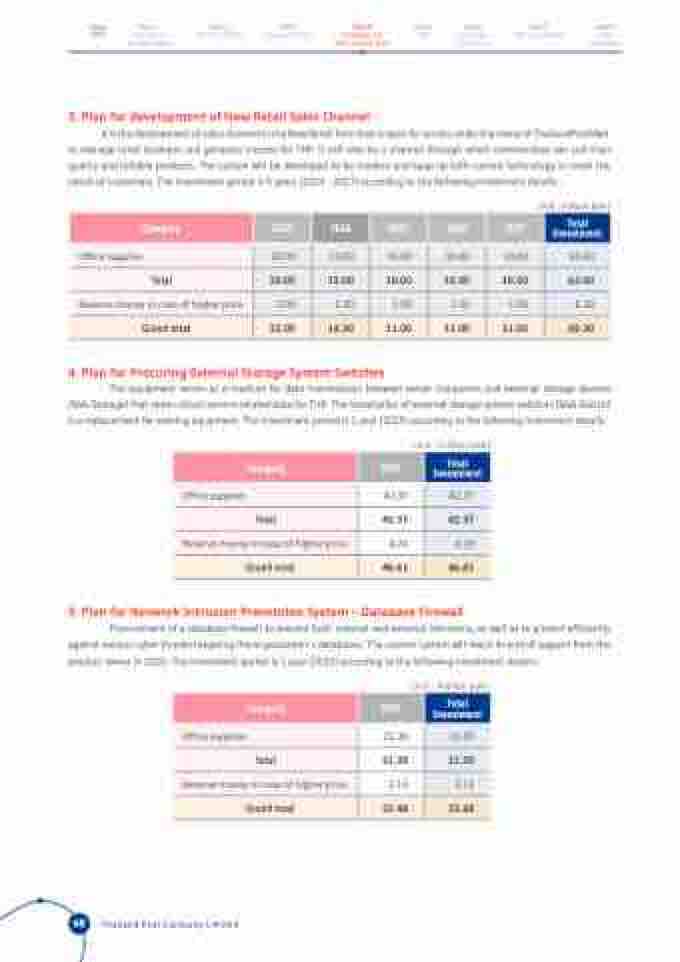 It is the development of sales channel in the New Retail form that is open for service under the name of ThailandPostMart to manage retail business and generate income for THP. It will also be a channel through which communities can sell their quality and reliable products. The system will be developed to be modern and keep up with current technology to meet the needs of customers. The investment period is 5 years (2023 - 2027) according to the following investment details :