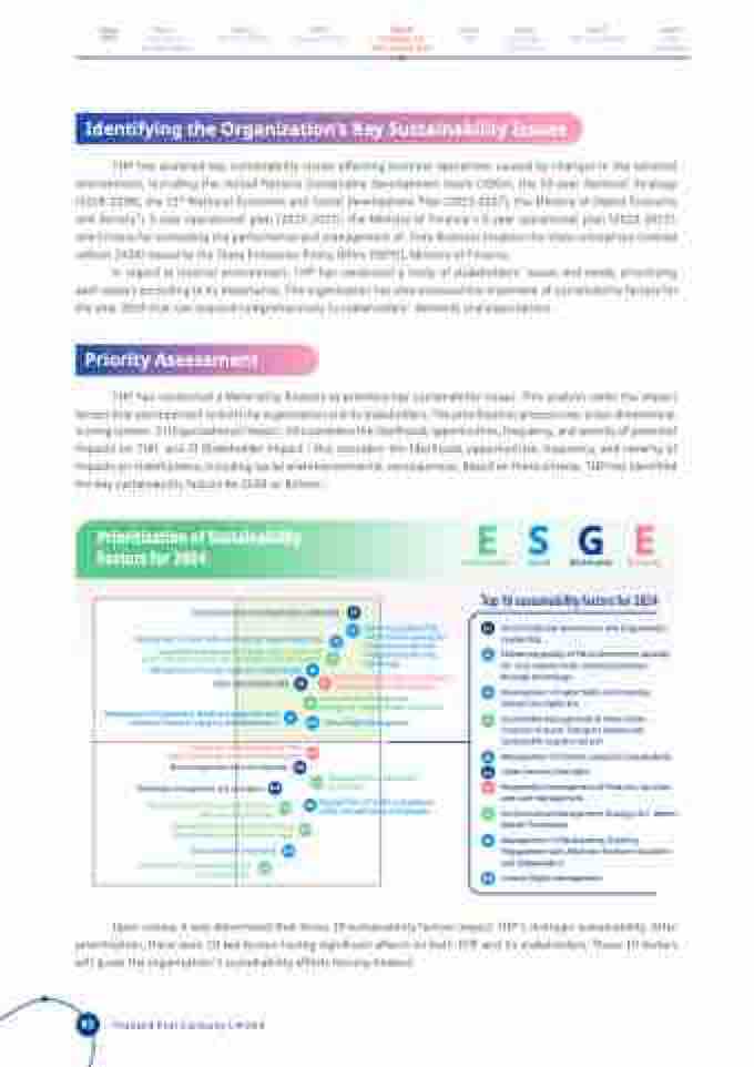 THP has conducted a Materiality Analysis to prioritize key sustainability issues. This analysis ranks the impact factors that are important to both the organization and its stakeholders. The prioritization process uses a two-dimensional scoring system : 1) Organizational Impact : this considers the likelihood, opportunities, frequency, and severity of potential impacts on THP; and 2) Stakeholder Impact : this considers the likelihood, opportunities, frequency, and severity of impacts on stakeholders, including social and environmental consequences. Based on these criteria, THP has identified the key sustainability factors for 2024 as follows :