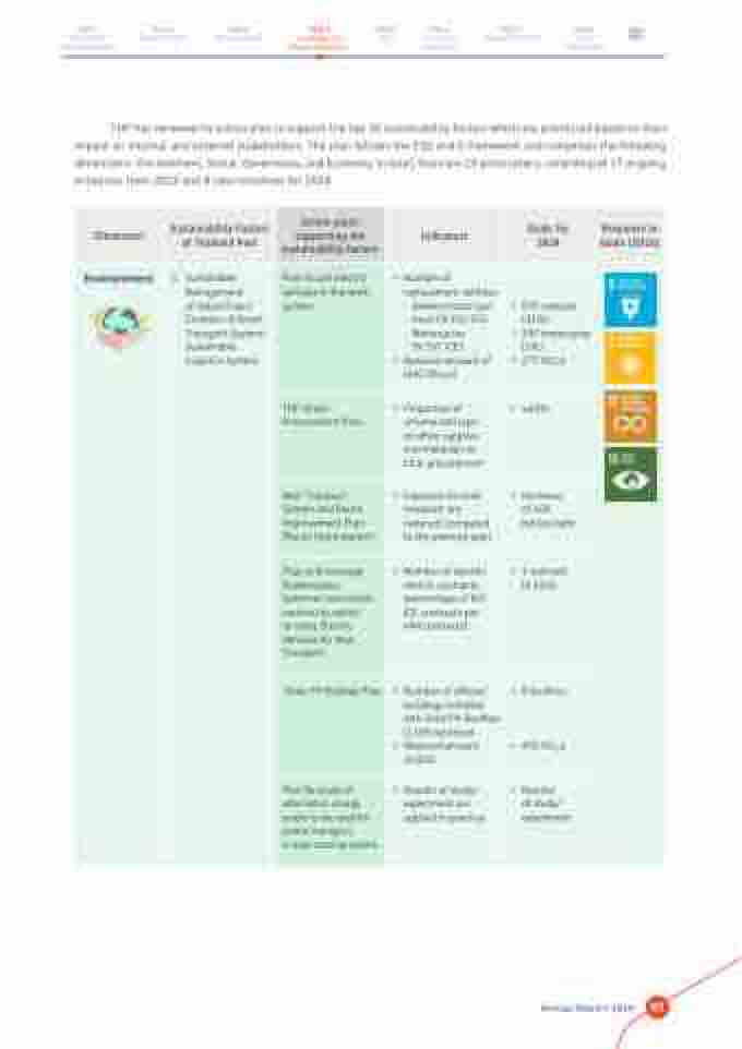 THP has reviewed its action plan to support the top 10 sustainability factors which are prioritized based on their impact on internal and external stakeholders. The plan follows the ESG and E framework and comprises the following dimensions : Environment, Social, Governance, and Economy. In total, there are 23 action plans, consisting of 17 ongoing initiatives from 2023 and 8 new initiatives for 2024.