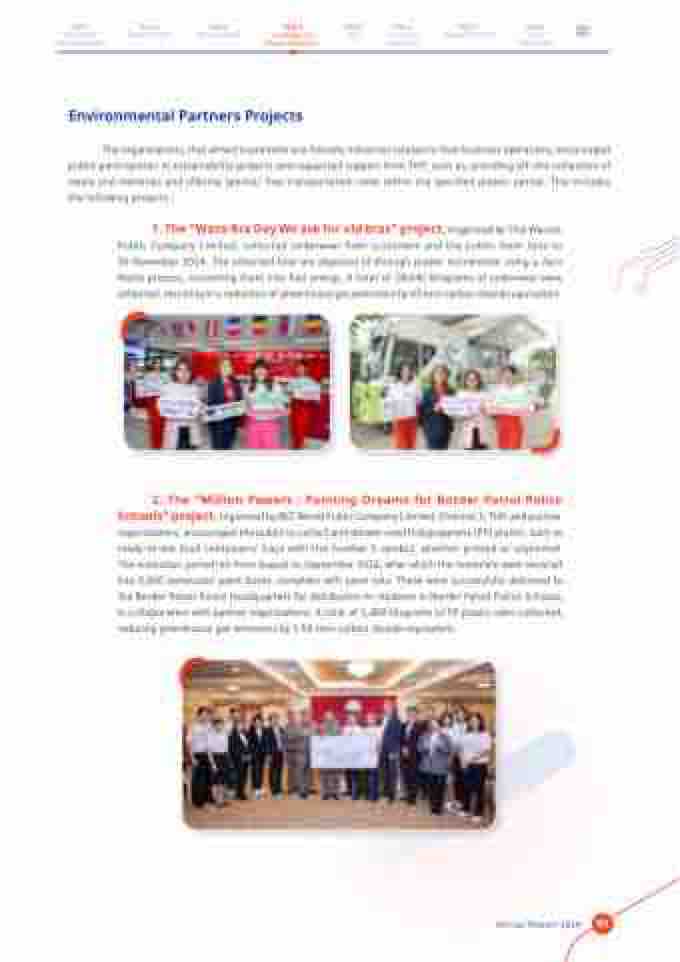 1. The “Waco Bra Day We ask for old bras” project, organized by Thai Wacoal Public Company Limited, collected underwear from customers and the public from June to 30 November 2024. The collected bras are disposed of through proper incineration using a Zero Waste process, converting them into fuel energy. A total of 28,640 kilograms of underwear were collected, resulting in a reduction of greenhouse gas emissions by 43 tons carbon dioxide equivalent.