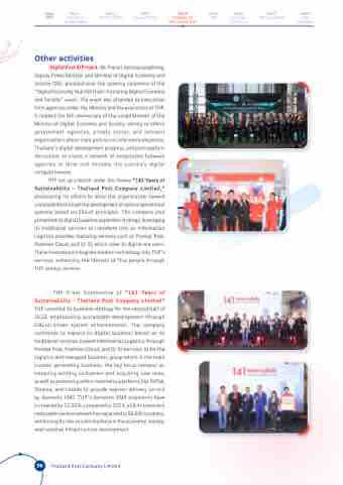 - THP Press Conference of “141 Years of Sustainability - Thailand Post Company Limited” THP unveiled its business strategy for the second half of 2024, emphasizing sustainable development through ESG+E-driven system enhancements. The company continues to expand its digital business based on its traditional services, toward Information Logistics, through Prompt Post, Postman Cloud, and D/ ID services. As for the logistics and transport business group which is the main income generating business, the key focus remains on retaining existing customers and acquiring new ones, as well as partnering with e-commerce platforms like TikTok, Shopee, and Lazada to provide express delivery service by domestic EMS. THP’s domestic EMS shipments have increased by 12.92% compared to 2023, and its extensive nationwide service network has expanded to 50,000 locations, reinforcing its role as a driving force in the economy, society, and national infrastructure development.