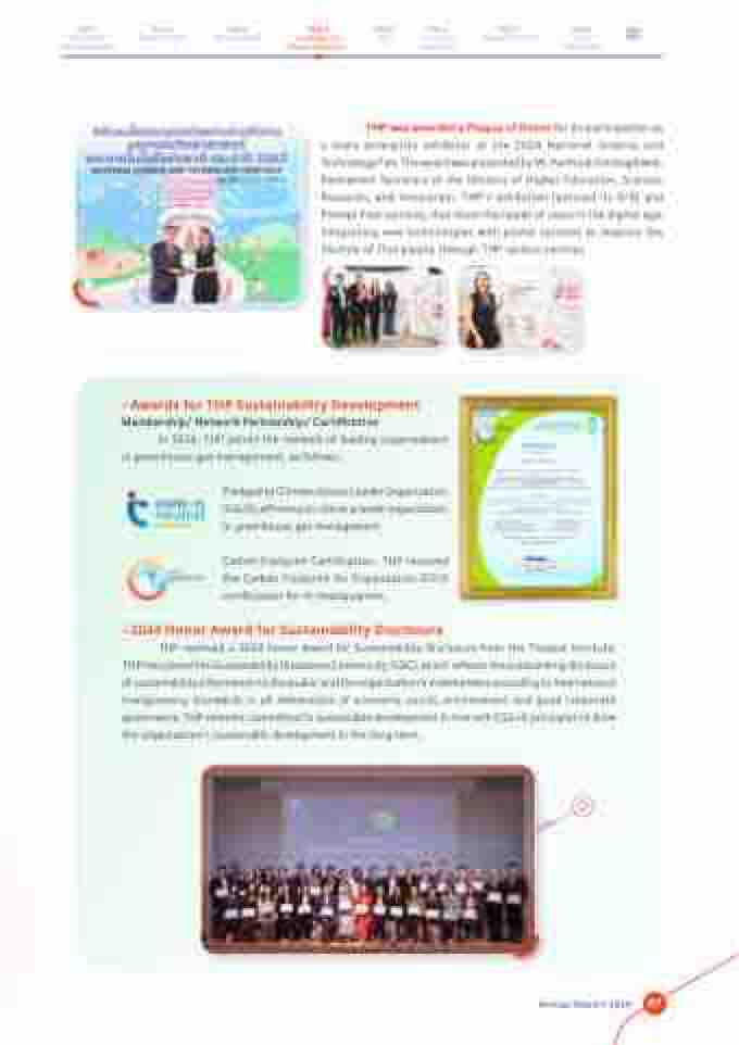 THP received a 2024 Honor Award for Sustainability Disclosure from the Thaipat Institute. THP has joined the Sustainability Disclosure Community (SDC), which reflects the outstanding disclosure of sustainability information to the public and the organization's stakeholders according to international transparency standards in all dimensions of economy, social, environment and good corporate governance. THP remains committed to sustainable development in line with ESG+E principles to drive the organization's sustainable development in the long term.