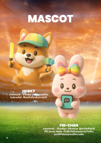 MASCOT 12 HOBKY คาแรกเตอร์ : สายเชีียร์ สายเอนเตอร์เทน ในสนามกีฬาทีใครเห็็นก็อดยม้ตามไม่ได้ FIN-CHAN คาแรกเตอร์ : เป็็นเห็มือน influencer ผู้้้บองโลกในแง่ดี ทีใชี้ Social Media เป็็นพื้ืนทสี นับสนุนความเท่าเทียบ และให็้กําาลังใจทุกคนทมี ีความฝััน