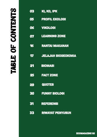 TABLE OF CONTENTS 03 KI, KD, IPK 05 PROFIL EKOLOGI 06 VIKOLOGI 07 LEARNING ZONE 16 RANTAI MAKANAN 17 JELAJAH BIOGEOKIMIA 21 BIOMASI 25 FACT ZONE 29 QUOTES 30 FUNNY BIOLOGI 31 REFERENSI 33 RIWAYAT PENYUSUN ECOMAGAZINE 02
