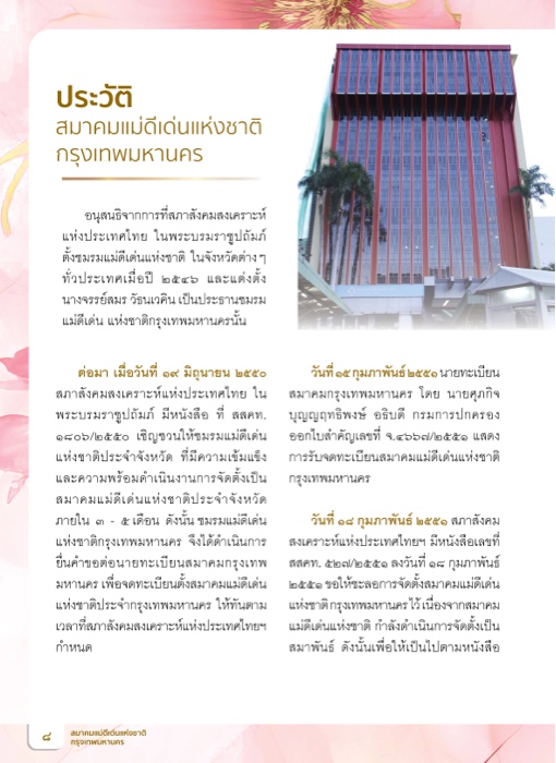 วนั ท่ี1๕กมุ ภาพนั ธ์๒๕๕1นายทะเบยี น สมาคมกรุงเทพมหานคร โดย นายศุภกิจ บุญญฤทธิพงษ์ อธิบดี กรมการปกครอง ออกไบสําาคัญเลขท่ี จ.๔๖๖๗/๒๕๕๑ แสดง การรับจดทะเบียนสมาคมแม่ดีเด่นแห่งชาติ กรุงเทพมหานคร