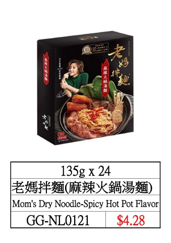 135g x 24 老媽拌麵(麻辣火鍋湯麵) Mom's Dry Noodle-Spicy Hot Pot Flavor GG-NL0121 $4.28