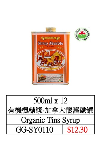 500ml x 12 有機楓糖漿-加拿大懷舊鐵罐 Organic Tins Syrup GG-SY0110 $12.30