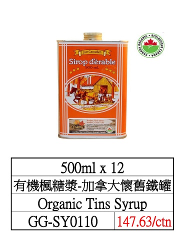 500ml x 12 有機楓糖漿-加拿大懷舊鐵罐 Organic Tins Syrup GG-SY0110 147.63/ctn