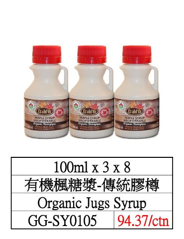 100ml x 3 x 8 有機楓糖漿-傳統膠樽 Organic Jugs Syrup GG-SY0105 94.37/ctn