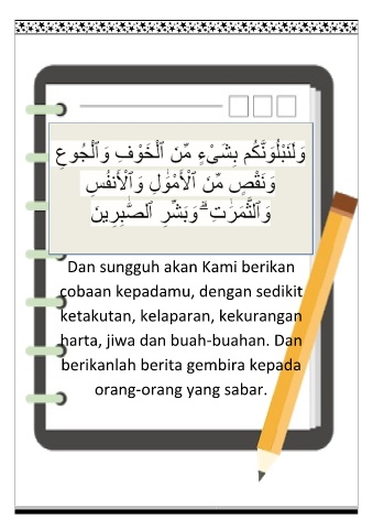Dan sungguh akan Kami berikan cobaan kepadamu, dengan sedikit ketakutan, kelaparan, kekurangan harta, jiwa dan buah-buahan. Dan berikanlah berita gembira kepada orang-orang yang sabar.