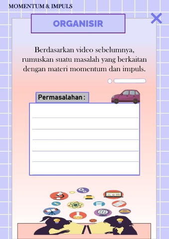 MOMENTUM & IMPULS ORGANISIR Berdasarkan video sebelumnya, rumuskan suatu masalah yang berkaitan dengan materi momentum dan impuls. Permasalahan :