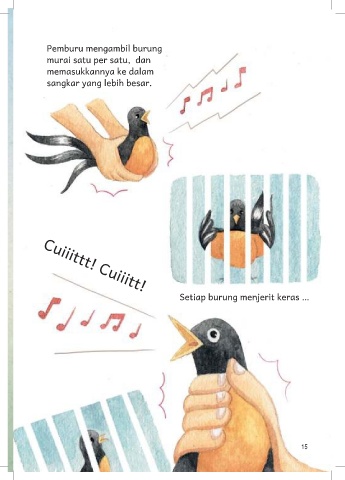 Pemburu mengambil burung murai satu per satu, dan memasukkannya ke dalam sangkar yang lebih besar. Cuiiittt! Cuiiitt! Setiap burung menjerit keras … 15