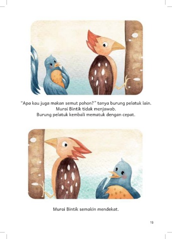 “Apa kau juga makan semut pohon?” tanya burung pelatuk lain. Murai Bintik tidak menjawab. Burung pelatuk kembali mematuk dengan cepat. Murai Bintik semakin mendekat. 19