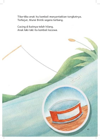 Tiba-tiba anak itu kembali menyentakkan tongkatnya. Terkejut, Murai Bintik segera terbang. Cacing di kaitnya telah hilang. Anak laki-laki itu kembali kecewa. 41
