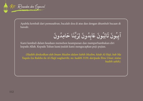 Apabila kembali dari pemusafiran, bacalah doa di atas dan dengan ditambah bacaan di