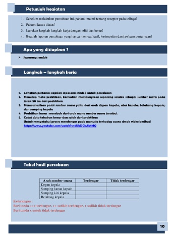1. Sebelum melakukan percobaan ini, pahami materi tentang reseptor pada telinga!