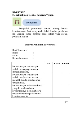 kesukaannya. Saat menyimak, isilah lembar penilaian