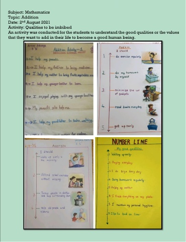 Subject: Mathematics Topic: Addition nd Date: 2 August 2021 Activity: Qualities to be imbibed An activity was conducted for the students to understand the good qualities or the values that they want to add in their life to become a good human being.