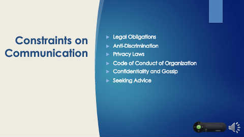 Constraints on Legal Obligations Anti-Discrimination Communication Privacy Laws Code of Conduct of Organization Confidentiality and Gossip Seeking Advice