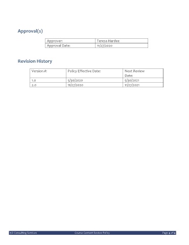 Approval(s) Approver: Teresa Hardee Approval Date: 11/27/2020 Revision History Version #: Policy Effective Date: Next Review Date: 1.0 5/30/2020 5/30/2021 2.0 11/27/2020 11/27/2021 I5O Consulting Services Course Content Review Policy Page 4 of 4