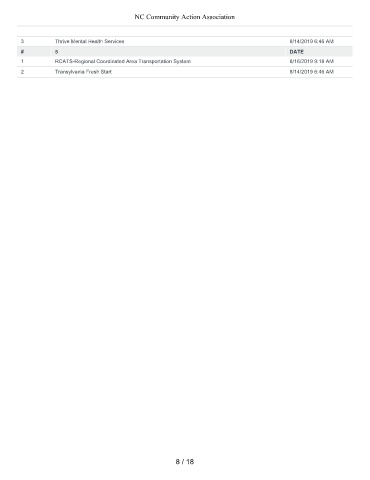 NC Community Action Association 3 Thrive Mental Health Services 8/14/2019 6:46 AM # 5 DATE 1 RCATS-Regional Coordinated Area Transportation System 8/16/2019 9:18 AM 2 Transylvania Fresh Start 8/14/2019 6:46 AM 8 / 18
