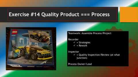 Exercise #14 Quality Product === Process Teamwork: Assemble Process/Project Recorder • Strategies • Rework Inspector • Quality Inspection/Review (at what junction) Process Owner/Lead