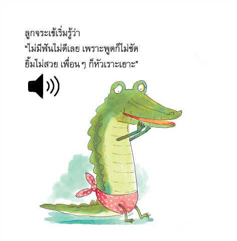 ลูกจระเข้เริ่มรู้ว่า “ไม่มีฟันไม่ดีเลย เพราะพูดก็ไม่ชัด ยิ้มไม่สวย เพื่อนๆ ก็หัวเราะเยาะ”