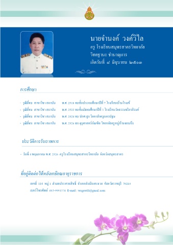- วุฒทจบ สาขาวิชา สถาบัน พ.ศ. 2524 จบ ปกศ.สง วิทยาลัยครนครปฐม