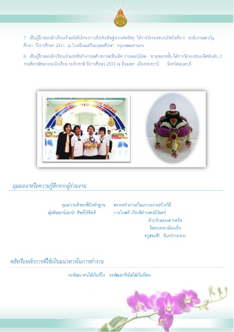 7. เปนผฝกสอนนักเรียนเขาแขงขันโครงงานสงประดษฐจากเศษวัสด ไดรางวัลรองชนะเลศอันดบ 1 ระดบกรมสามญ
