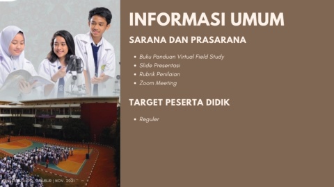 INFORMASI UMUM SARANA DAN PRASARANA Buku Panduan Virtual Field Study Slide Presentasi Rubrik Penilaian Zoom Meeting TARGET PESERTA DIDIK Reguler S M P L A B S C H O O L C I B U B U R | N O V . 2 0 2 1