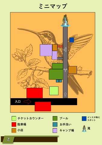ミニマップ 入口 チケットカウンター プール インスタ映え スポット 駐車場 お手洗い 小店 キャンプ場 滝 2 2