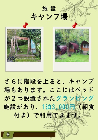 施 設 キャンプ場 さらに階段を上ると、キャンプ 場もあります。ここにはベッド が2つ設置されたグランピング 施設があり、1泊3,000円(朝食 付き)で利用できます。 8 8