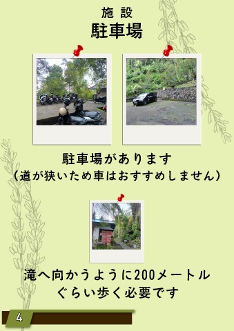施 設 駐車場 駐車場があります (道が狭いため車はおすすめしません) 滝へ向かうように200メートル ぐらい歩く必要です 4 4