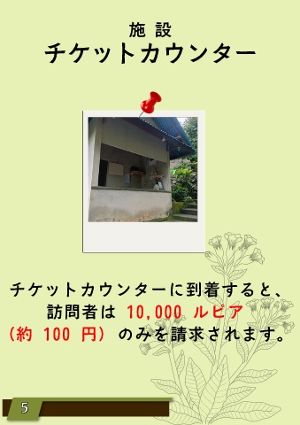 施 設 チケットカウンター チケットカウンターに到着すると、 訪問者は 10,000 ルピア (約 100 円) のみを請求されます。 5 5