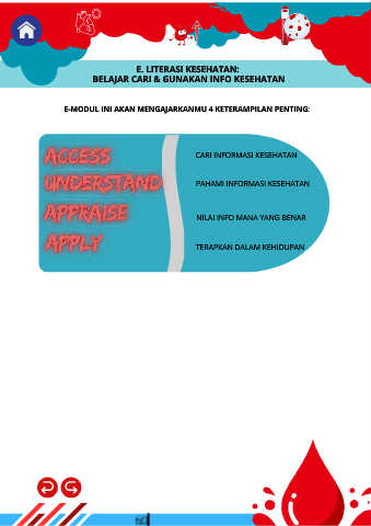E. LITERASI KESEHATAN: BELAJAR CARI & GUNAKAN INFO KESEHATAN E-MODUL INI AKAN MENGAJARKANMU 4 KETERAMPILAN PENTING: CARI INFORMASI KESEHATAN PAHAMI INFORMASI KESEHATAN NILAI INFO MANA YANG BENAR TERAPKAN DALAM KEHIDUPAN