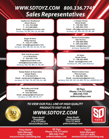 territory: VT, ME, NH, RI, CT orders@sdtoyz.com