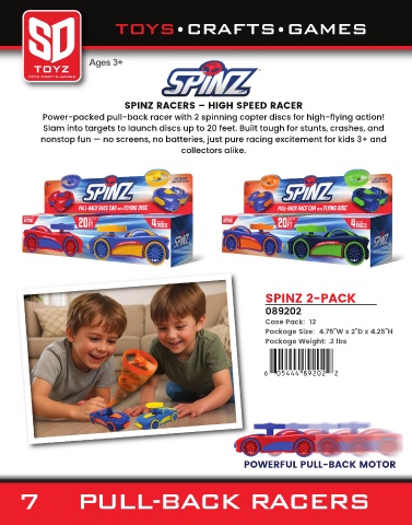 Power-packed pull-back racer with 2 spinning copter discs for high-flying action!