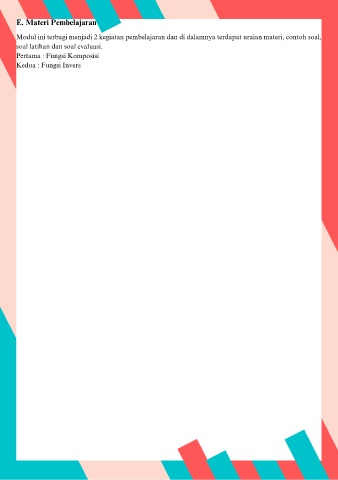 E. Materi Pembelajaran Modul ini terbagi menjadi 2 kegiatan pembelajaran dan di dalamnya terdapat uraian materi, contoh soal, soal latihan dan soal evaluasi. Pertama : Fungsi Komposisi Kedua : Fungsi Invers