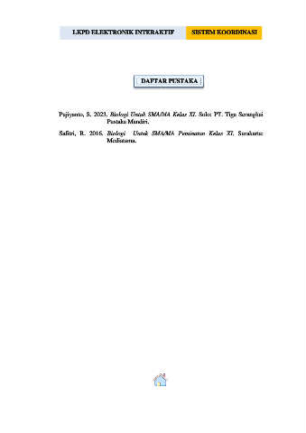 LKPD ELEKTRONIK INTERAKTIF SISTEM KOORDINASI DAFTAR PUSTAKA Pujiyanto, S. 2023. Biologi Untuk SMA/MA Kelas XI. Solo: PT. Tiga Serangkai Pustaka Mandiri. Safitri, R. 2016. Biologi Untuk SMA/MA Peminatan Kelas XI. Surakarta: Mediatama.