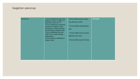 Konfirmasi 1.Guru memberikan tugas atau 1.Peserta didik mencatat tugas 30 menit