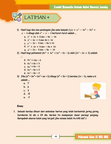 2) Hasil bagi polinomial (8 + 4 + − 9 − ) oleh ( − + ) adalah