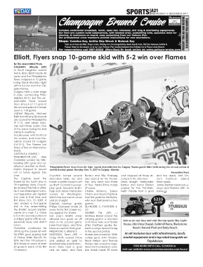 sisted on another as Wash- Philadelphia Flyers’ Sean Couturier, right, has his shot deflected by Calgary Flames goalie Mike Smith during the second period of