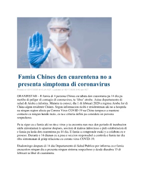 salud di Aruba a informa. Manera ta conoci, dia 1 di februari 2020 a regresa Aruba for di