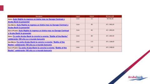 Description Layout Cm/col PR Cost in Afl.