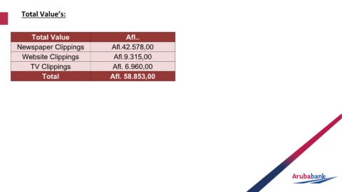 Total Value’s:: Total Value Afl.. Newspaper Clippings Afl.42.578,00 Website Clippings Afl.9.315,00 TV Clippings Afl. 6.960,00 Total Afl. 58.853,00