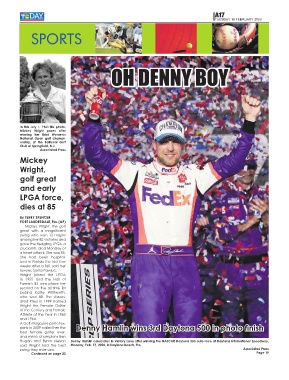 Hogan and Byron Nelson Denny Hamlin celebrates in Victory Lane after winning the NASCAR Daytona 500 auto race at Daytona International Speedway,