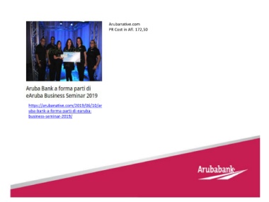 Arubanative.com PR Cost in Afl. 172,50 https://arubanative.com/2019/06/10/ar uba-bank-a-forma-parti-di-earuba- business-seminar-2019/